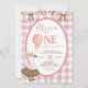 Rosa Quirky Hand plockade Ett Fånig är på födelsedag, brun kokvett på födelsedagen Inbjudan, Editable Preppy Rosa Balloon First Birthday