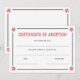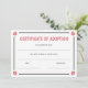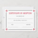 Sött husdjur antagande certifikat i vitt med en ram för tassavtryck. Rosa och vit adoptioncertifikat tryckt med söta tassavtryck. Vitt och rosa certifikat för husdjurs adoption med söta typsnitt och tassar.