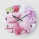 En klocka med ett utsökt fotografi som visar en torn av rosa makaroner med hallon placerade runt. Det är en underbar gudomlig.