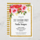 Utformningen av vattenfärgen i blommigten i hörnet och chicen som ramats in av en faux glitter gräns i guld är dessa födelsedagsfest inbjudan underbara för alla åldrar. All text, typsnitt, färg, storlekar kan ändras, klicka bara på länken Anpassa ytterligare. MATCHING-objekt i vår butik.