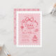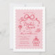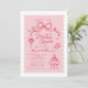 Rosa & Red Whimsical Retro Hand plockade Inbjudningskort för möhippan. Ett trendig stil med söta duvor av bokor, staplade cocktailglas, blommor och högklackar parade med viskartat och roligt handskrivet stil typsnitt på en skalopad bakgrund. Kortets baksida har en koordinerande överarmsbåge mönster men kan strykas. Alla färg är redigerbara av er! © Kimbelled, LLC