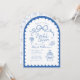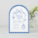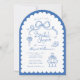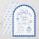 Dusty Blue och White Whimsical Retro Hand plockade Inbjudningskort för möhippan. Ett trendig stil med söta duvor av bokor, staplade cocktailglas, blommor och högklackar parade med och roligt handskrivet stil typsnitt på en skalopad bågbakgrund. Kortets baksida har en koordinerande överarmsbåge mönster men kan strykas. Alla färg är redigerbara av er! © Kimbelled, LLC