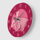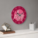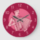 Den här klockan har en rosa illustration av att ett glamoröst dam spelar dragspel.