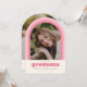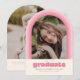 Detta roliga retroinspirerade examensbevis har plats för ett foto på framsidan, inramad av en valv i rosa nyanser. Det finns också utrymme för examenens namn, skola och årskurs. Baksidan av beviset har plats för ett andra foto och mer text.