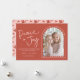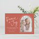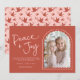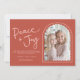 Rosa röd modern välvd Julkortsfoto för fred och glädje. Fred + Glädje i en handskriven stilsnitt. Ett välvt foto har en modern twist med en söt vågig kant och en ytterkant som framhäver året. Visas i en fantasifull och rolig färgskala i rosa och orange-röd, men alla färger (fram- och baksida) kan redigeras, inklusive bakgrund, text och designelement. Behåll det hoppfulla budskapet som visas eller anpassa med din egen text. Anpassa mallen med ditt/dina namn och foto. Baksidan av kortet är ett roligt, spritt mönster av duvor - vissa håller i grenar och vissa i en julgransprydnad. © Kimbellished, LLC
