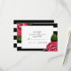 En enkel, modern inbjudan från bröllop r.s.v.p. med shock rosa över en svart och vit strimlad bakgrund.