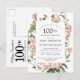 Ät en speciell kvinna med den här eleganten 100 Födelsedagsfest inbjudan. Rosa ros som är inkapslat i mjuk grönt löv löv bildar ett modernt botaniskt ram. Hela texten kan redigeras så att du kan beskriva ditt speciella firande perfekt
