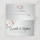 Ett platskort för elegant och lyxiga tittar silver bröllop i bord, ett silver-tema med rosa ros och en mindre rosa ros bouquet på baksidan.