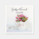 Elegant Rosa ros Flowers i Tekanna Bröllop Pappra Napkins kan vara personlig med namnen av bruden och brudgummen och datum för använda vid finare party och möhippa i giftermål och mottagning av party och . Dessa engångsservetter av hög anpassningsbar i klasserna har ett foto av en blommigt av en blomkruka fylld med rosa ros och vit satin.