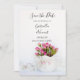 Söt Rosa ros Flowers i Tekanna Bröllop spara datum annonscertifikat anger tonen för ceremonin och mottagningen i giftermål. Denna elegant anpassningsbar blomstrar under den kritiska behållan med datumangivelsen ett botaniskt foto av en porslinsburk fylld med rosa ros med vit satin. Perfekt till paret som planerar ett party eller ett högtebröllop.
