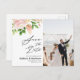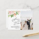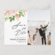 Rosa ros grönska Elegant skript Foto Bröllop Spara datum Annonseringskort. Låt din familj, vänner och kollegor veta att ni har bestämt ett datum för er bröllopsfirande med detta eleganta, stilrena och moderna bröllop spara datum inbjudningskort. All text är förarrangerad för att du enkelt och snabbt ska kunna anpassa den med dina egna detaljer.