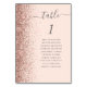 Det moderna kortet för bordsnummer i bröllop som är lämnat kant i eleganten har ett faux glitter guld i ro. Ord "bord" visas i ett handskriftsskript för grått med kol på rosa. Lägg till namnen för de gäster som tilldelats varje bord.
