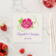 En bröllop-napkin skräddarsydd med bruden och rummen namn och deras bröllop-datum. Ett enkelt exempel på ett rosa ros med grönt petaler och en snabb stjälk.