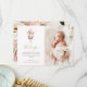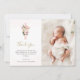 De vackra Baptism- eller Christening-tackkort som du har har har en fantastisk bukett av söt rosa ros och grönt fern löv över en matchande rosa kor. Skripttypografi för Faux guld finns också och du kan lägga till ditt baby-foto. Kortets baksida har en härlig utformning av mer rosa blommor för ett känsligt och kvinnligt blommigt.
