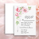 Mönsterkort för bröllop OSA och måltider med rosa och vit ros med diamant inslag, sage grönt löv och elegant text. Grymma bröllop OSA med blommigtens bakgrund. Baksidan har en söt rosa blommigt ro bröllop tårta.