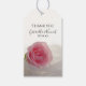 Tacka era gäster för att de deltog i er eleganta trädgårdsfest, bridal shower eller bröllopsceremoni och mottagning när ni fäster det vackra personliga Rosa ros på vit bröllopspresentkort på deras present eller lilla gåva. Dessa klassiska anpassade blommiga tackpresentkort har en floral fotografi av en rosa rosblomma med en vit brudslöja.