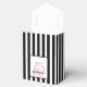 En förmånslåda för en 50:e födelsedagsfest, oavsett ålder. Klassiskt svart och vitt lodrät rand som bakgrund. Med giftiga och feminina rosa Flowers, ro som dekoration. Med texten: Tack! En vit och svart ram på framsidan med mall för ålder, namn och datum. Ålder nummer 50 i rosa, namn och datum i svart. Namn är skrivet med ett handskript i stil.