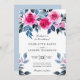 Inbjudan till elegant bröllop som har skarp rosa ro, blått och grått blad på vit bakgrund. Den omvända sidan av inbjudan är i dammig blå färg.