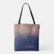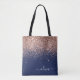 Marinblå, Rosa Guld och Rosa Falskt Glitter och Glans Elegant Monogram Väska. Denna väska kan anpassas till att inkludera din initial och förnamn och ges som en present till jul, söt 16-årsdag, bröllopsfest eller ett bröllop.