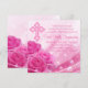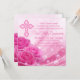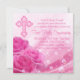 Första kommunion inbjudan med rosa ros och elegant rosa kors på en vacker rosa ros glänsande bubbla bakgrund. Du kan enkelt anpassa denna snygga första kommunion inbjudan genom att lägga till dina evenemangsuppgifter i typsnittets storlek och färg, samt formulering efter eget val.