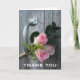 Ett tackkort med ett foto av en liten bukett med tre ljusrosa rosor och grönska inslagna med jutesnöre vilande i handtaget på en lada dörr. Vit text på framsidan säger "Tack". Insidan är tom. Detta kort kan också köpas i mindre storlek. Sök efter matchande bröllopsinbjudningar och mer hos Jill's Paperie.