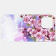 Artiskt ritad, gren av rosa, körsbärsfärger på blommar på picturesque, texturerad bakgrund, målad med vit, rosa och blå färg. Rosa Sakura