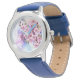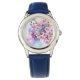 Artiskt ritad, gren av rosa, körsbärsfärger på blommar på picturesque, texturerad bakgrund, målad med vit, rosa och blå färg. Rosa Sakura