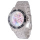 Artiskt ritad, gren av rosa, körsbärsfärger på blommar på picturesque, texturerad bakgrund, målad med vit, rosa och blå färg. Rosa Sakura