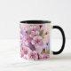 Artiskt ritad, gren av rosa, körsbärsfärger på blommar på picturesque, texturerad bakgrund, målad med vit, rosa och blå färg. Rosa Sakura
