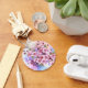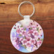 Artiskt ritad, gren av rosa, körsbärsfärger på blommar på picturesque, texturerad bakgrund, målad med vit, rosa och blå färg. Rosa Sakura