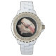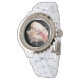Stor rosa snigelskal damklocka. Vacker bild av ett snigelskal känd för sin rosa nyans inuti, är satt på svart, inuti en kant av strass. Eller välj denna tropiska design på vilken typ av klocka som helst.