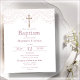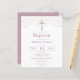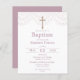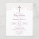 Baptisminbjudan med rosa snöre print och guld effect crucifix på vit bakgrund. Redo för enkel anpassning.