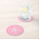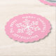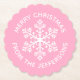 En vit snöflinga på rosa med "God jul" från familjen i en cirkel kring den.