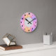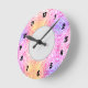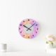 En väggklocka med en munkavle och en rosa prismbakgrund.