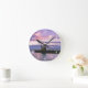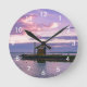 Vacker soluppgång i rosa över vatten och silhuett med liten hut. Twilight över sjö. Solnedgång över pier i Volendam, Nederländerna.