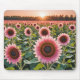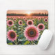 Ett vibrerande fält av rosa solblommor står högt mot bakgrunden av ett sol som kastar en varm glöd över petalerna och löv