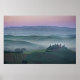 Poster en dimbildande soluppgång med rosa himlar och dimma mellan Toskana backe över agriturismo podere il Belvedere i Valdorcia (Orcia Valley) mellan Pienza och San Quirico i Toskana, Italien.