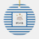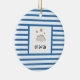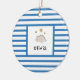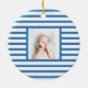 Elegant, modern och söt baby-foto runt ornament på marinblått rand mönster. Den här mallen visar på ett bra sätt Rosa baby dinosauer som sover under guld gultens stjärnor med anpassningsbar Baby namn. Underbar för både pojke och flicka. Perfekt för alla säsonger!