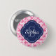 En ljus rosa- och vit förreglande fyrkantig mönster-bakgrund med en marin blå kvadratfolieetikett ram med anpassade namn och monogrammall. Monogrammat färgstarkt, chic, trendig, geometriskt mönster.