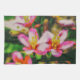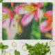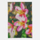 Den ursprungliga konstverket av ZoeSPEAK på denna kökshandduk är ett intryck gjort från ett originalfotografi av rosa jatropha-blommor, fulla blommor och knoppar. Solen var så stark att blommorna tycks hoppa ut från sin gröna bladbakgrund. Deras gula centra framhäver effekten. Bilden är ett lyckligt färgstänk.