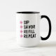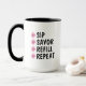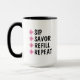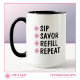 Denna anpassningsbara kaffekopp har enkla rosa och svarta blommor med fet typografi som lyder “SIP, SAVOR, REFILL, REPEAT.” Modifiera de fyra textområdena för att skapa en unik present till familj, vänner, kollegor eller någon kaffeälskare på din inköpslista.