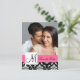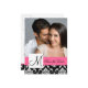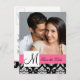 Elegant svart-vit vintage Damaskus-mönster med förlovningsfoto Spara datum postkort med rosa accentfärg. Skicka ut dina förlovningsannonser till era gäster med detta vackra postkort och anpassa det med ert förlovningsfoto, monogram initial, brudens och brudgummens namn och bröllopsdatum. Design av Elke Clarke © Grafik och exempelbild licensierad för användning.