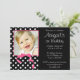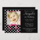 En söt rosa och svart flickas födelsedagsfest inbjudan. Med ett svart och vitt prickigt mönster med en rosa båge grafik. Lägg enkelt till ditt eget foto och anpassa med din information. För att ändra storlek och placera ditt foto, klicka på "ANPASSA" knappen. Design är platt tryckta illustrationer/grafik - INTE FAKTISK BÅGE.