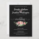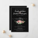 Denna bröllopsinbjudan har en blandning av modern och traditionell typografi tillsammans med en traditionell bukett av rosa rosor på svart bakgrund. Designen matchar Smell the Roses Bröllopssamling.
