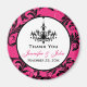 Denna moderna och trendiga fuchsia rosa, svarta och vita takkronan bröllop tack magnet har en utsmyckad rosa och svart virvlar och rullar kant som matchar bröllopsinbjudan nedan. Du kan också anpassa den till att säga "Spara datumet" och använda den för att meddela din kommande vigsel till din familj och vänner. Om det finns några andra matchande föremål du behöver, vänligen maila din förfrågan till niteowlstudio@gmail.com.