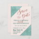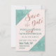 Elegant, chic och glamorösa utskrifter av tealblått glitter-sekvinhörn och ro guld-skript på ljusbakgrund för rosa, Spara-the-Date bröllop-kort. Denna klassiska och sofistikerade utformning är perfekt för det trendig och det snyggt som gifter sig. Anpassa med ditt eget meddelande på framsidan och en anpassad inledande monogram på baksidan. All fotoutskriftsdesign.