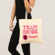 Roligtens bröllopsfest kan duka med väskan med rosa grafik i tryckt text som läser Team Bride. Skripttext för rosa av anpassningsbar, på grund, är redo att anpassa sig för hela brudens sida. Digitalgrafik från en bloom i rosa ros dekorerar det lämnat grund. Perfekt för att hålla alla viktiga små sak kan brudens sida-medlemmarna inte glömma.
