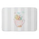 Ett badmatt med en vismisk illustration. En rosa tekanna med lite rosa hjärta i mitten och en bukett blommor inuti. Fintvätt av delikat pastellhaltig färgad som flödar omkring. Ställ in på en grått- och vit stripe-bakgrund.