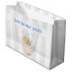 Personlig stor presentväska för födelsedag eller andra tillfälle. Designad med en liten illustration. En rosa tekanna med lite rosa hjärta i mitten och en bukett blommor inuti. Fintvätt av delikat pastellhaltig färgad som flödar omkring. Ställ in på en grått- och vit stripe-bakgrund.