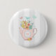 En knapp med visuell illustration. En rosa tekanna med lite rosa hjärta i mitten och en bukett blommor inuti. Fintvätt av delikat pastellhaltig färgad som flödar omkring. Ställ in på en grått- och vit stripe-bakgrund.
